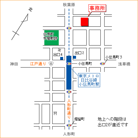 地下鉄ご利用の方は出口2および出口4から地上に出る。 小伝馬町交差点から人形町通りを秋葉原方向に進む。 最初の信号を右折。30m先、左側のニッケイビル2階。