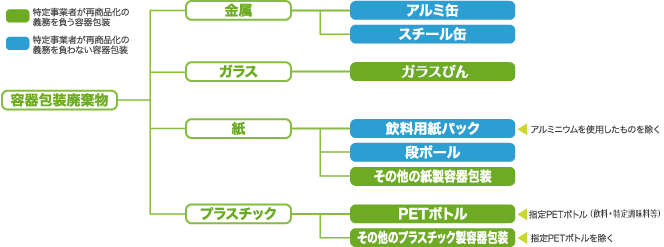 容リ法の分別収集の対象となる容器包装は、ガラスびん、PETボトル、紙製容器包装、プラスチック製容器包装、アルミ缶、スチール缶、紙パック、段ボールですが、アルミ缶以下の4品目については、すでに市場経済の中で有価で取引されており、円滑なリサイクルが進んでいるので、再商品化義務の対象とはなっていません。(※PETボトルは有価で取引されていますが、まだ安定した状況とはいえないので継続して再商品化義務の対象となっています)