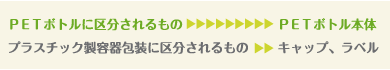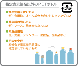 PETボトルの識別表示マークの対象品は、PETボトルのリサイクルに適した製品(指定表示製品)に限定されます。指定表示製品以外のPETボトルは、プラスチック製容器包装として、市町村のルールにしたがって別途、分別排出をお願いします。