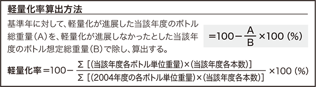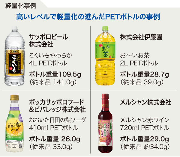 個別では、対象容器の主要17種のうち6種※1で前年度より軽量化が進み、また5種※2で、2025年度軽量化目標値を達成しました(図2)。今後も、さらなる軽量化に向けて努力を続けていきます。