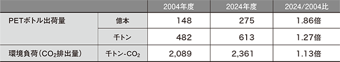 2024年度の清涼飲料用PETボトルの出荷本数は、275億本となり、3R推進のための自主行動計画を定めて取り組みを開始した2004年度比で1.86倍になっています。一方で、軽量化の効果および大容量から小容量への容器構成変化などにより、出荷ボトル重量は1.27倍と抑えられています。