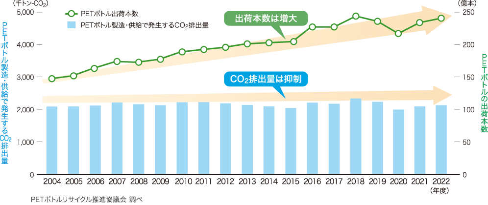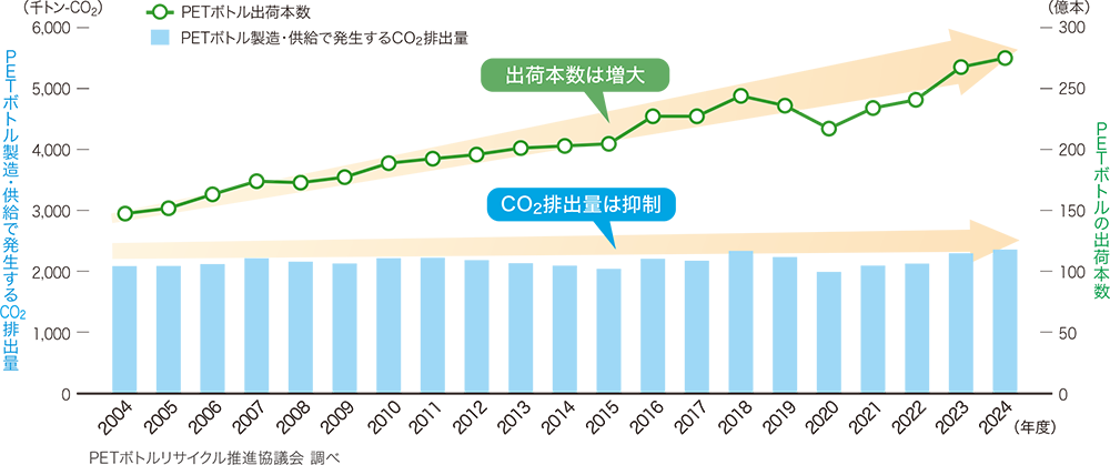 このようにPETボトルは、2004年から需要が伸びてきましたが、軽量化をはじめとする省資源・省エネルギーの取り組みの効果により、CO2排出量が抑制されているのが分かります(図3)。