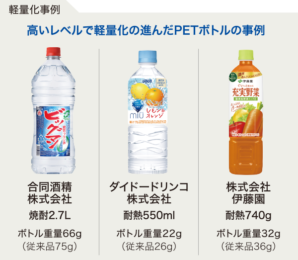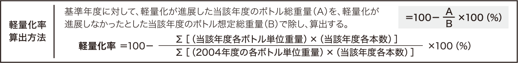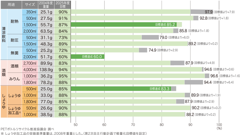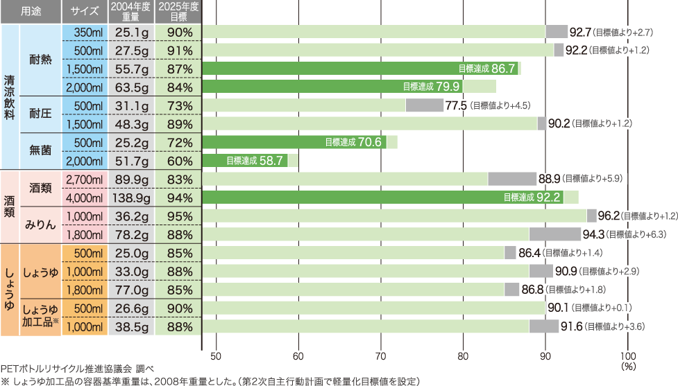 推進協議会による3R推進のための自主行動計画2025において、「指定PETボトル全体で25%以上の軽量化(2004年度比)」を目標に設定しています。2024年度は全体で28.1%の軽量化となり目標を達成しました。