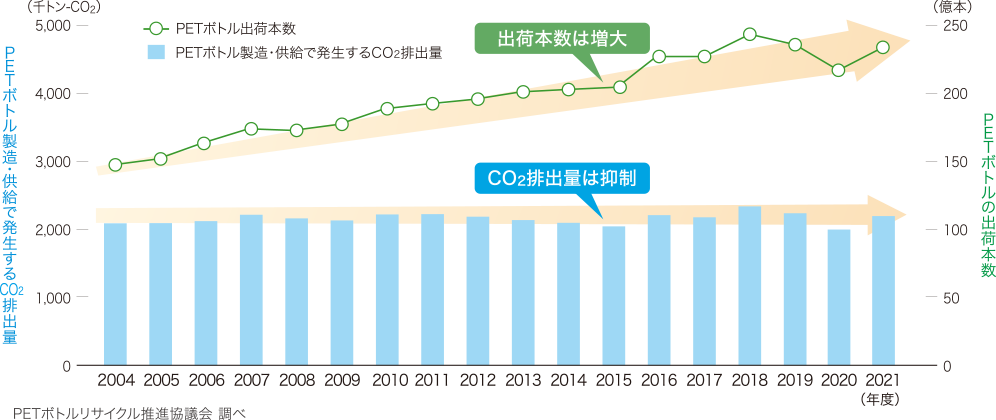 図3. 清涼飲料用PETボトルの出荷本数と、その環境負荷(CO2排出量)の推移