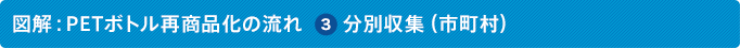 市町村は消費者から分別排出されたPETボトルを収集し、中間処理(選別・圧縮梱包・保管)を行い、リサイクルに適した状態(分別基準適合物)にして、事業者に引き渡します。