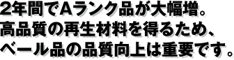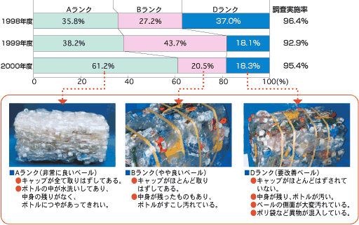 | 高品質の再生材料を得るには、ベールの品質が重要です。ベール品の評価(下図)を見ると、市町村や関連施設の不断の努力により、2年間でベールの品質がかなり向上していることがわかります。 ベール品のさらなる品質向上のためには、消費者のご協力が重要です。排出時に内容物の残りがないようにして、軽くすすぎ、横方向につぶしてください。キャップは取りはずします。ラベルはそのままでも構いませんが、市町村によっては取り除くようにしている所もあります(そのラベルやキャップは「プラスチック容器包装」として「PETボトル」とは別にして排出してください)。口部の下に残ったプラスチックのリングはそのままで結構です。 次いで、収集場所や中間処理施設で汚されたり異物が混入することのないようにお願いします。 せっかくきれいにして出していただいたPETボトルが、運搬・保管・中間処理などで汚れや異物の混入があると、リサイクルの工程で設備の破損を起こす、あるいは水・エネルギーなどを多く使うなどでリサイクルコストのアップだけでなく環境への負荷も増大してしまいます。 また、当推進協議会では、自主設計ガイドライン※1)を作成するなどして、よりリサイクルしやすいボトルを作るための努力を続けています。 すでに業界の各社がこの基準を守り、着色ボトルの廃止、ラベルをはがしやすくするためにミシン目を入れるなどを実施しています。 消費者の皆様方には、リサイクルの品質向上に向けた事業者の取り組みにご理解をいただき、ご協力をお願いいたします。 |