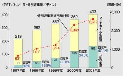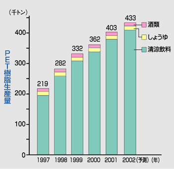 | (出所)PETボトル協議会 ※暦年ベース(1月〜12月) ※輸入品含む ※1997年〜2001年は実績、2002年は予測 |