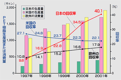 | 日本のPETボトルリサイクルが進んでいることは、海外のリサイクルデータと比較すれば明らかになります。 分別収集量と生産量の比率を回収率と呼びます。この回収率データを日本、米国、欧州(EU)間で比較してみます。 日本の回収率は毎年急速に上昇しており、2001年度の実績値は40.1%と2000年度の34.5%を大きく上回りました。さらに2002年度には46.0%に達するものと期待されます。 一方米国は、2000年の22.3%から2001年には22.1%になりました(「米国の回収率が低下している原因は?」参照)。欧州は2000年の16.6%から17.9%へ上昇しています。 日本のPETボトルの回収システムは欧米に遅れてスタートしましたが、短期間のうちにその回収率は世界の最高水準に達しました。 |