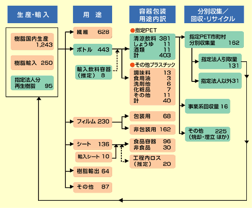 PETボトル用樹脂(ポリエステル樹脂)の流れを中心としてマテリアルフロー(2001年度)を見てみると、右の図のようになっています。