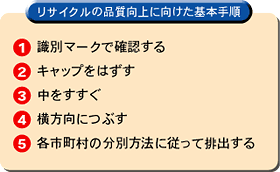 | 容器包装リサイクル法では、従来はマテリアルリサイクルだけが再商品化手法として認められていましたが、2001年5月より化学分解法も再商品化手法として公的に認められました。PETボトルリサイクルは、今後、多様な手法で進められていきます。 また、リサイクルの品質向上には、再商品化施設に入ってくる原料としての使用済みボトルがきれいなものであることが重要です。それによって、リサイクル設備への負荷や使用する電力などのエネルギー、洗浄に使用する水の汚れも少なくて済み、省資源・省エネルギーにつながります。 |