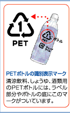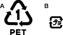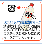 清涼飲料、しょうゆ、酒類用のPETボトルにはPETの識別マーク(右記A)の表示が義務づけられていますが、2000年4月法律が改正され※1)、新たにプラスチック(右記B)の表示も加わりました。