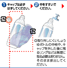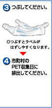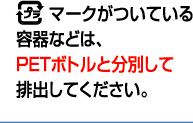 新しい表示制度では、清涼飲料、しょうゆ、酒類用のPETボトルの表示は下図-1・上段のように、それ以外の用途のPETボトルおよびプラスチック製ボトルの表示は下図-1・下段に変わり、部材(パーツ)名も明確に表示されていますので、より分別排出がしやすくなりました。