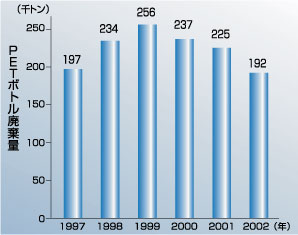 | 廃棄されているPETボトルの量を、生産量と収集量の差をもって推し量ると、1999年の256千トンをピークとして2000年以降は減少傾向を示しています。 特に2002年の廃棄量は対前年比マイナス14%以上の大幅な減少となりました。これは、市町村による分別収集の進展と合わせて、事業者等による回収の実態が徐々に明らかになってきたことによります。 推進協議会が2001年から事業系回収について精査を進めた結果、市町村分別収集以外の部分は、すべてごみとして廃棄(焼却・埋立等)されているわけではなく、むしろかなりの部分がリサイクル(輸出も含む)されているのではないかという確信が強まっています(「樹脂の動向 PETボトル用樹脂の〜」、「事業系回収PETボトルの確認・検証」参照)。 |