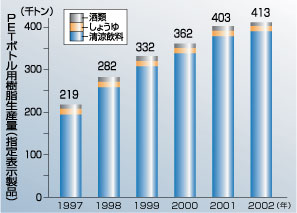 | PETボトル用途の約90%以上を占めるPETボトル清涼飲料の生産量の伸びは順調であり、1997年から2001年までは一貫して毎年10%以上の増加傾向にありました。2002年は、茶系飲料の需要拡大やホット対応ボトルの開発などによって、対前年比+7.3%(容量ベース)と相変わらず高い伸び率を示しており、ボトル本数で見ても同様に伸びています。 一方で、2002年のPETボトル用樹脂生産量は対前年比+2.4%と伸び率は安定化を見せています。 これはリデュースを推進するべく、業界をあげてPETボトルの軽量化に取り組んだ結果、全体として飲料容量1リットルあたりのボトル重量を対前年比で4.3%軽減できたためです。個別の具体例としては、500mlボトルで従来の32gから26gに(軽量化率18.8%)、1,500mlでは従来の59gから55g(軽量化率6.8%)に軽量化したことなどがあげられます(「リデュース(樹脂使用量削減)として〜」参照)。 |