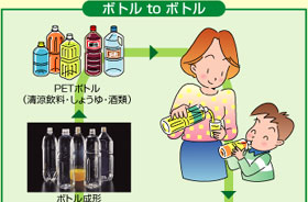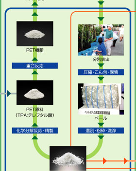 | 2001年5月、従来の手法に加えて化学分解法が再商品化手法として公的に認められました。 化学分解法の処理能力は、2002年度30千トンで始まり、繊維用のPET樹脂を作るのに使用されました。2003年度には60千トン規模に拡張され、食品ボトル(主に飲料)用のPET樹脂が作られる予定です。 |