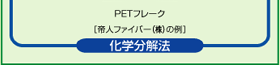 | 化学分解法は、PETボトルを化学的に分解してPET原料に戻し、再びPET樹脂を作る方法です。 PETボトルを化学分解するには、メチルアルコール、エチレングリコール、水等が用いられます。分解した成分を蒸留や吸着によって精製します。 |