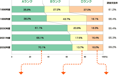 (財)日本容器包装リサイクル協会は、品質の優れたベール(圧縮・こん包されたPETボトル)を確保するために、長期間にわたりベールを調査してきました。 市町村の指導や住民のご協力のおかげで、市町村からのベールのランク別比率も下図のように年々向上し、2002年度のベールの品質は1998年度に比べるとAランク品が著しく多くなっています。 これらの実績を踏まえて、(財)日本容器包装リサイクル協会は2003年度に関してはベール品質の調査を行いませんでした。2004年度からは、あらためて調査を実施します。 |