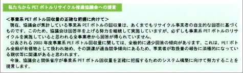PETボトルの回収量は、市町村での分別収集の進展などにより、年々増加しています。しかしながら約4割のPETボトルについては、使用後の実態が把握されていません。 推進協議会では市町村分別収集ルート以外にも、事業者によって回収され、リサイクル、あるいは輸出に向けられている量の調査を2000年度から実施しています。 2003年度の調査結果によると、事業者から確実に回収されているPETボトルの量は少なくとも55千トン(2003年度の生産量の12.5%に相当)はあり、市町村分別収集以外のものは、すべてが廃棄されているのではないことが明らかになりました。 また、本年度は事業系ルートの排出・回収形態の分類とその業種を整理するとともに、昨年に引き続き、事業系回収量に関して第三者機関に数量把握を委託し、監査法人による監査を受けました。 |
