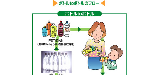 ● ● ● ● ● ● ● ● ● ● ● ● ● 化学分解法の実例として帝人ファイバー(株)の化学分解プロセスについて紹介します。 この工場では回収ボトルを化学的に分解して、DMT(テレフタル酸ジメチル)とEG(エチレングリコール)という物質として精製し、DMTをさらにボトル用PET樹脂の原料である精製TPA(テレフタル酸)とするものです。 作られたTPAを同工場内の重合プラントでボトル用PET樹脂にすることで、再びボトルに生まれ変わります。 同社の化学分解法の利点は、回収ボトルを分子レベルに分解し精製することにより、石油から製造するPET樹脂原料とまったく同等の高純度原料が得られるようになるところにあります。 この原料から作られるPETボトルも、現在流通されているものと同様、清涼飲料、しょうゆ、酒類、乳飲料等の用途にも対応でき、かつ品質のまったく変わらない、透明できれいなボトルになります。 |