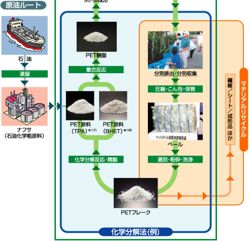 化学分解法は、PETボトルを化学的に分解してPET原料に戻し、再びPET樹脂を作る方法です。 この方法は、メチルアルコール、エチレングリコール、水等を用いてPETボトルを化学的に分解し、分解した成分を蒸留や吸着によって精製したのち、再びPETを作る方法です。