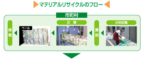 PETボトルリサイクルの手法の中で、「マテリアルリサイクル」は容器包装リサイクル法施行以前から行われています。「マテリアルリサイクル」ではPETボトルを物理的に粉砕したものを原料として再利用しています。分別収集されたPETボトルは再商品化施設で粉砕されフレークとなり、そのフレークが原料として再利用されています。フレークは下の図にあるような工程を通して作られています。