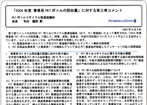 PETボトルの回収量は、市町村での分別収集の進展などにより年々増加しています。しかしながら、約4割のPETボトルについては、使用後の実態が把握されていません。推進協議会では、市町村ルート以外にも事業者によって回収され、リサイクル、あるいは輸出されている量の調査を2001年度から実施しています。 この調査により、市町村分別収集以外のものは、全て廃棄されていないことが既に明らかになっています。 2004年度の調査結果によると、事業者から確実に回収されているPETボトルの量は、少なくとも81千トン(2004年度の生産量の16%に相当)ありました。 また、2004年度は2003年度に引き続き、事業系ルートの排出・回収形態の分類と業種を整理(※表6参照)するとともに、事業系回収量調査による数量把握を第三者機関に委託し、監査法人による監査を受けました(監査法人の第三者コメントの詳細はこちらをご参照ください)。 監査報告書では、把握が困難な事業系回収量を今回の調査で約81千トン把握できたことに対して、推進協議会の姿勢や努力に大きな評価をいただきました。なお、今後の課題として回収されたPETボトルの品質向上や、国の協力による国際資源循環量(輸出入量)の把握等のコメントを受けました。今後も推進協議会は、さらなる事業系回収量把握に努力していきます。 |
