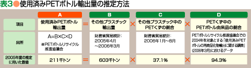 2005年度の「その他プラスチックくず」の輸出量に2006年1月〜8月までの「その他プラスチックくず」と「PETくず」の比率を掛け、2005年度の「PETくず」の輸出量を推定しました。さらに推進協議会が行った調査の「PETくず」に含まれる「使用済みPETボトル」の割合から「使用済みPETボトル」の量を推定しました(表3)。2005年度の推定輸出量は211千トンになります。 |