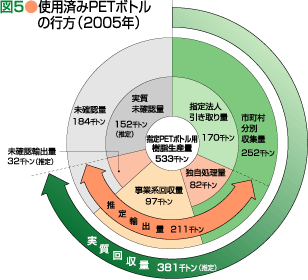 2005年度の市町村分別収集量は252千トンであり、そのうち独自処理された82千トンが全て輸出されたと見なすと、実質的な回収量は指定法人引き取り量170千トンと推定輸出量211千トンを合計した381千トン以上となります。