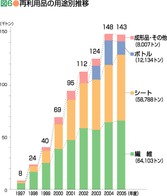 ボトル製品はボトルtoボトルが2004年4月から商品として店頭に並びました。2005年度の数量は12千トン、対前年度比52%となりました。 |
