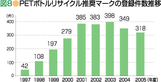 一方、PETボトル協議会による右記のような「PETボトルリサイクル推奨マーク(登録商標)」の登録件数は、2004年度に引き続き高水準を維持しています。