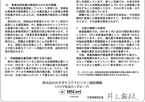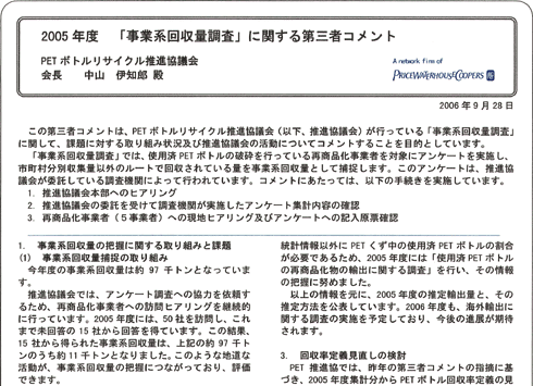 | 推進協議会では、2001年度よりアンケート調査を調査機関に委託し、事業系回収量の捕捉・集計を行ってきました。この捕捉・集計プロセス及び推進協議会の活動に対して、2002年度から第三者機関によるコメントを受けています。 |