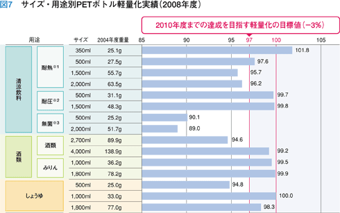 2008年度実績では、対象15容器のうち13の容器で軽量化が実施され、そのうち6つの容器で目標である3%の軽量化を達成しました。清涼飲料分野の無菌の500ml・2,000mlボトルは、会員各社の技術改善の進捗により大幅な軽量化を実現しています。