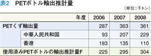 市町村系23社分、事業系13社分の回答があり、2007および2008年度通年の調査結果より、回収物から得られる PETリサイクル物の割合を求めました。(表3) ![]() ![]() 国内向けおよび海外向けPETリサイクル量を推計