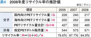 推進協議会調査による2008年度国内向け回収量E245千トンから表3を用いて国内にて再利用される国内向けPETリサイクル量Gを217千トンと推計しました。その際、推進協議会での2008年度回収量調査結果である[市町村系64:事業系36]に基づき計算を行いました。