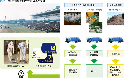 競馬場内で飲用されたPETボトルは分別回収し、処理施設や紡績工場を経て、競走馬のゼッケンや競馬場内の清掃係員・ガードマンの制服に再生利用されています。 |