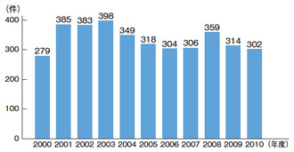 PETボトルリサイクル推奨マーク(登録商標)は、使用済みのPETボトルが25%以上使用されている製品につけられています。製品にPETボトル再利用品が使用されていることを伝えると共に消費者が商品を購入する際の目安となります。マーク取得の認定はPETボトル協議会が行い、1995年より運用しています。2010年度の登録件数は302件でした。