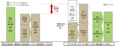 そして、最終的にキャップ・ラベルを含まない再生材料としてリサイクルされるまでの「リサイクル率」の算出をしました。