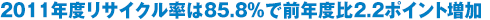この要因は後に詳しく述べますが、事業系回収量の把握が進んだことに起因します。推進協議会では3R推進のため、2015年度までの第2次自主行動計画の中で、「リサイクル率85%以上の維持」を目標として掲げており、2011年度は目標値を達成することができました。