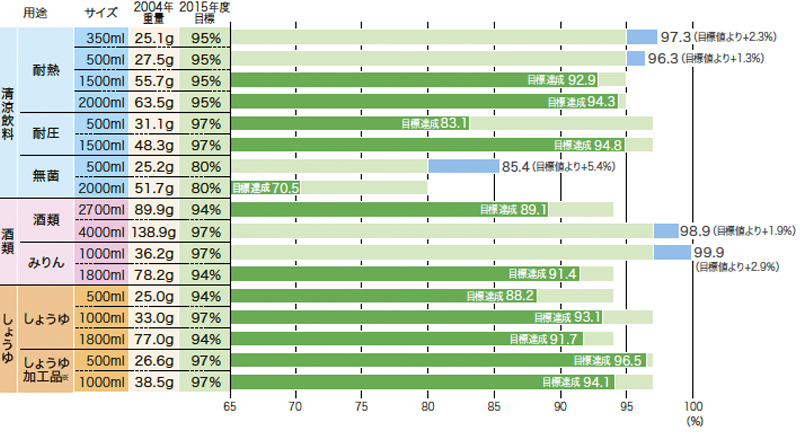 図:図6 サイズ・用途別PETボトル軽量化目標と実績