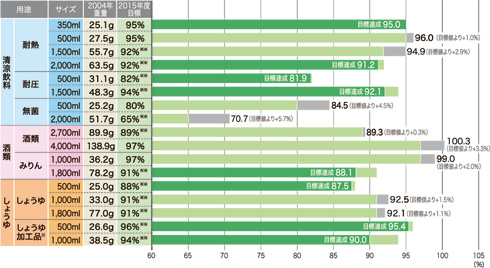 第2次自主行動計画3年目の2013年度実績では、対象容器の主要17種のうち12種で昨年度比軽量化が進み、また8種で修正後の2015年度軽量化目標を達成しました(清涼飲料の耐熱350ml・2,000ml、耐圧500ml・1,500ml、酒類のみりん1,800ml、しょうゆ500ml、しょうゆ加工品500ml・1,000ml)。