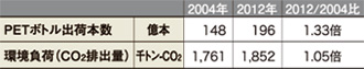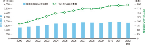 図2に、清涼飲料用PETボトルの本数と、その原油採掘からボトル製造・供給に至る環境負荷の指標としてのCO2排出量を経年で示しました。