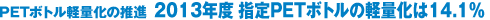 推進協議会では、3R推進団体連絡会の一員として、第2次PETボトルのリデュース目標「指定PETボトル全体で13%(2004年度比)軽量化」を設定し、その後2013年11月に15%へ上方修正しました。それにともない、主要17種についての個別目標値も修正し(2014年3月 3%~35%)、軽量化を推進しています。その結果、2013年度は全体で14.1%の軽量化を達成しました。