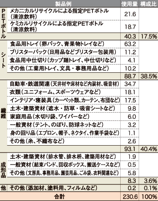 各用途別の具体的製品例と再生PETフレークの使用量を表3に示します。