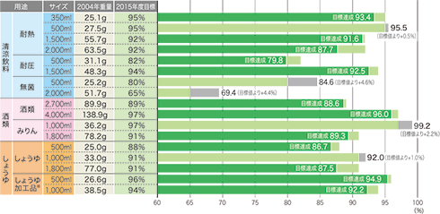 第2次自主行動計画4年目の2014年度実績では、対象容器の主要17種のうち12種で昨年度比軽量化が進み、また12種で修正後の2015年度軽量化目標を達成しました(清涼飲料の耐熱350ml・1,500ml・2,000ml、耐圧500ml・1,500ml、酒類2,700ml・4,000ml、酒類のみりん1,800ml、しょうゆ500ml・1,800ml、しょうゆ加工品500ml・1,000ml)。