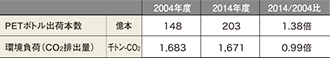 PETボトルは、需要の伸びにともない出荷本数を増加させてきましたが、3R推進のための自主行動計画を定めて取り組みを開始した2004年度以降は、出荷本数の増大に比べCO2排出量の増大が抑制されているといえます(表2)。