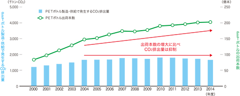 図2に、清涼飲料用PETボトルの出荷本数と、その原油採掘からボトル製造・供給に至る環境負荷の指標としてのCO2排出量を経年で示しました。