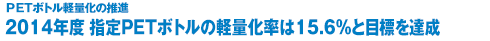 推進協議会では、3R推進団体連絡会の一員として、2011年3月に第2次PETボトルのリデュース目標「指定PETボトル全体で13%(2004年度比)軽量化」を設定し、その後2013年11月に15%へ上方修正しました。それにともない、主要17種についての個別目標値も修正(2014年3月 3%~35%)しました。その結果、2014年度は全体で15.6%の軽量化となり、目標値(修正値)15%を達成しました。