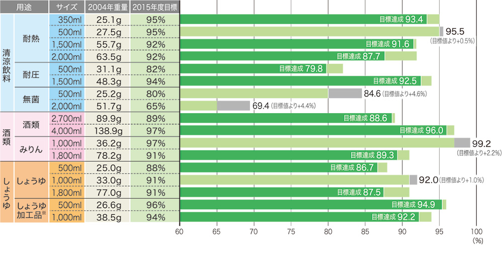 図:図1:サイズ・用途別PETボトル軽量化目標と実績(2013年度)