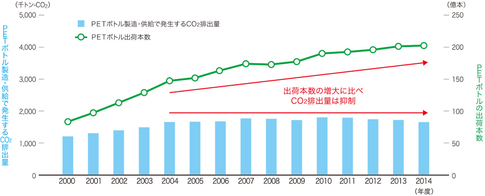 図:図2:清涼飲料用PETボトルの出荷本数と、その環境負荷(CO2排出量)の推移