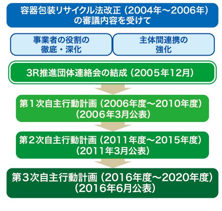 2005年10月、社団法人日本経済団体連合会(当時)は「実効ある容器包装リサイクル制度の構築に向けて」を取りまとめ、事業者の自主的な取り組みが重要であることを表明しました。これを受けて3R推進団体連絡会は、「容器包装リサイクル法の目的達成への提言」を行い、2006年3月に第1次自主行動計画を発表しました。